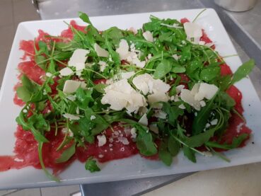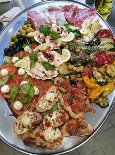 mit frischen Paprika, Tomaten, Gurken, Zwiebeln, Oliven, gebratenen Champignons, gehobeltem Parmesan & Rucola