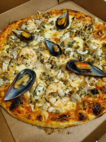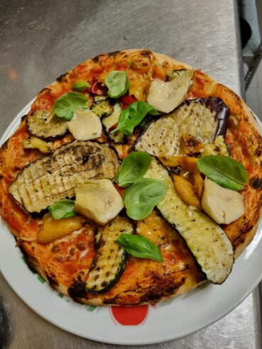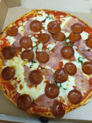mit Salami *1,2,4, Zwiebeln, Pilzen, Peperoniwurst *1,2,4 & Formfleischvorderschinken *2,4