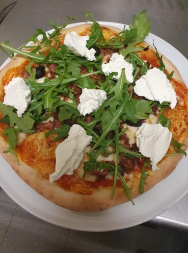 mit Peperoniwurst *1,2,4 Gorgonzola, frischen Pilzen & Zwiebeln