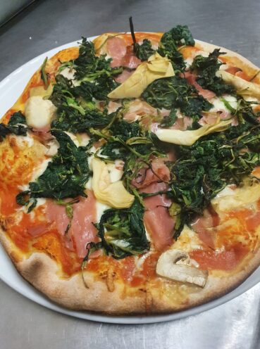 mit Pilzen, Salami *1,2,4, Zwiebeln, Peperoniwurst *1,2,4 , Oliven, Paprika, Artischocken & Formfleischvorderschinken *2,4